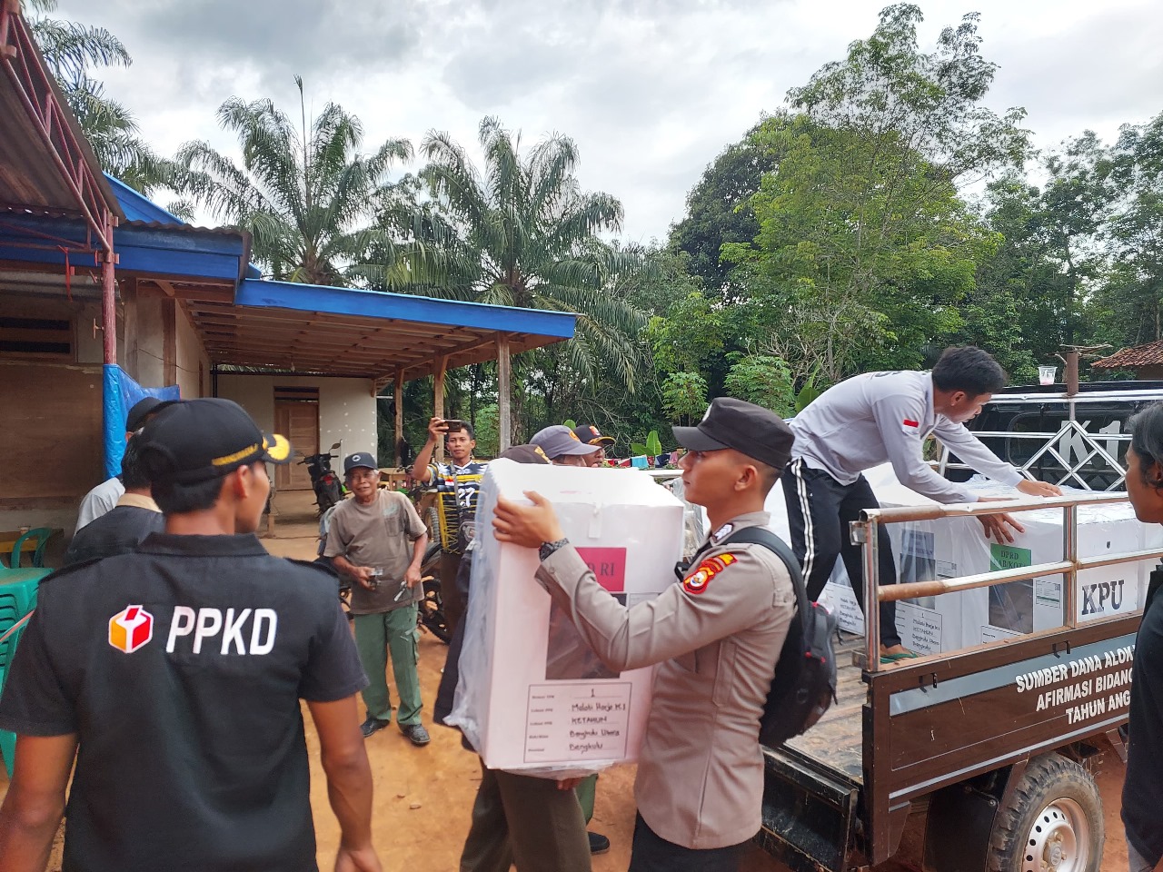 Bengkulu Utara – Dalam rangka kesiapan pelaksanaan Pemilu tahun 2024 pada hari Selasa 13 Februari 2024, telah dilaksanakan proses pengawalan oleh anggota unit Lantas, dan Polsek Ketahun distribusi kotak dan bilik suara Pemilu tahun 2024 dari gudang penyimpanan Logistik pemilu KPU di Desa Melarti Harjo Kecamatan Ketahun menuju TPS di Desa Melati Harjo Kecamatan Ketahun.