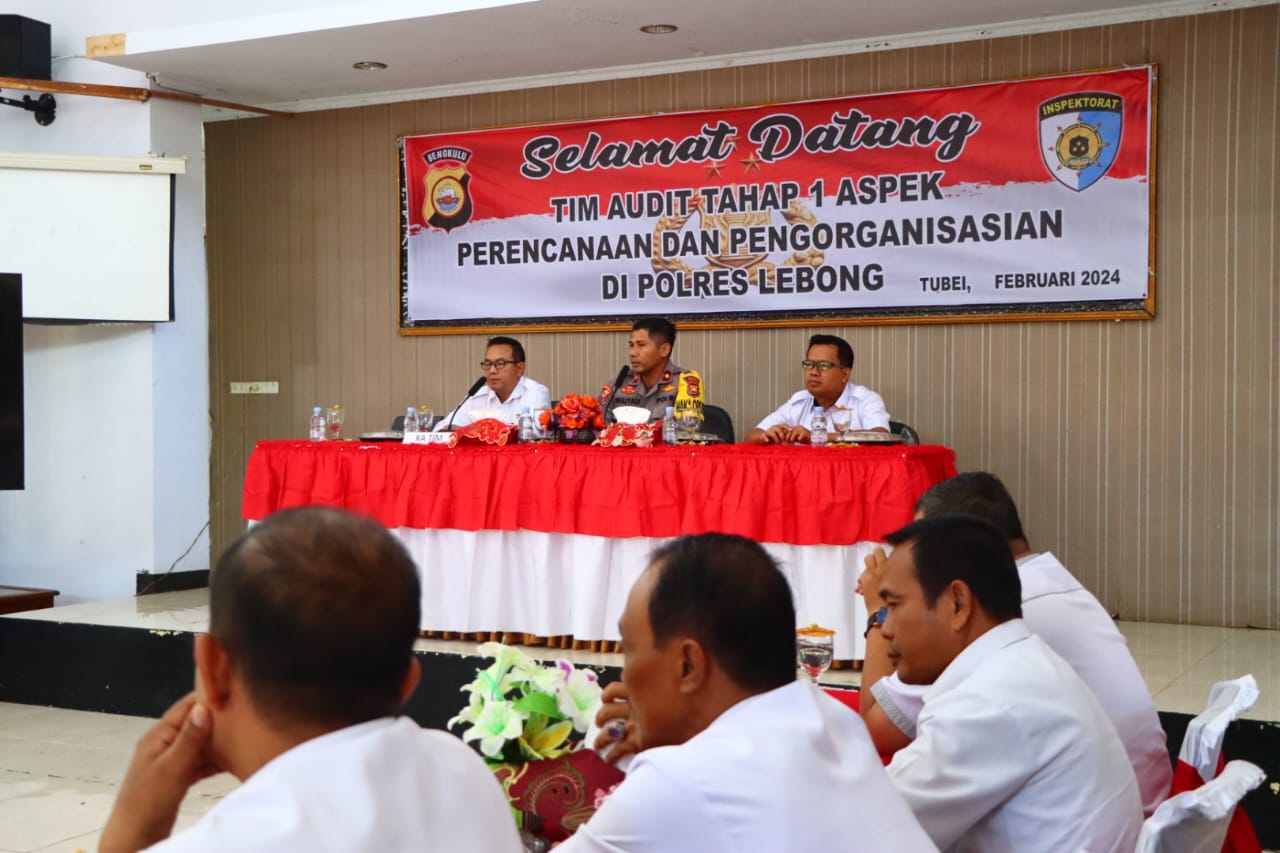 Kegiatan audit berlangsung di Aula Polres Lebong, Selasa (27/2/2024), dipimpin AKBP Max Mariners, dan anggota tim AKBP Yayat Ruhiyat, AKBP Nuswanto, dan lainnya.
