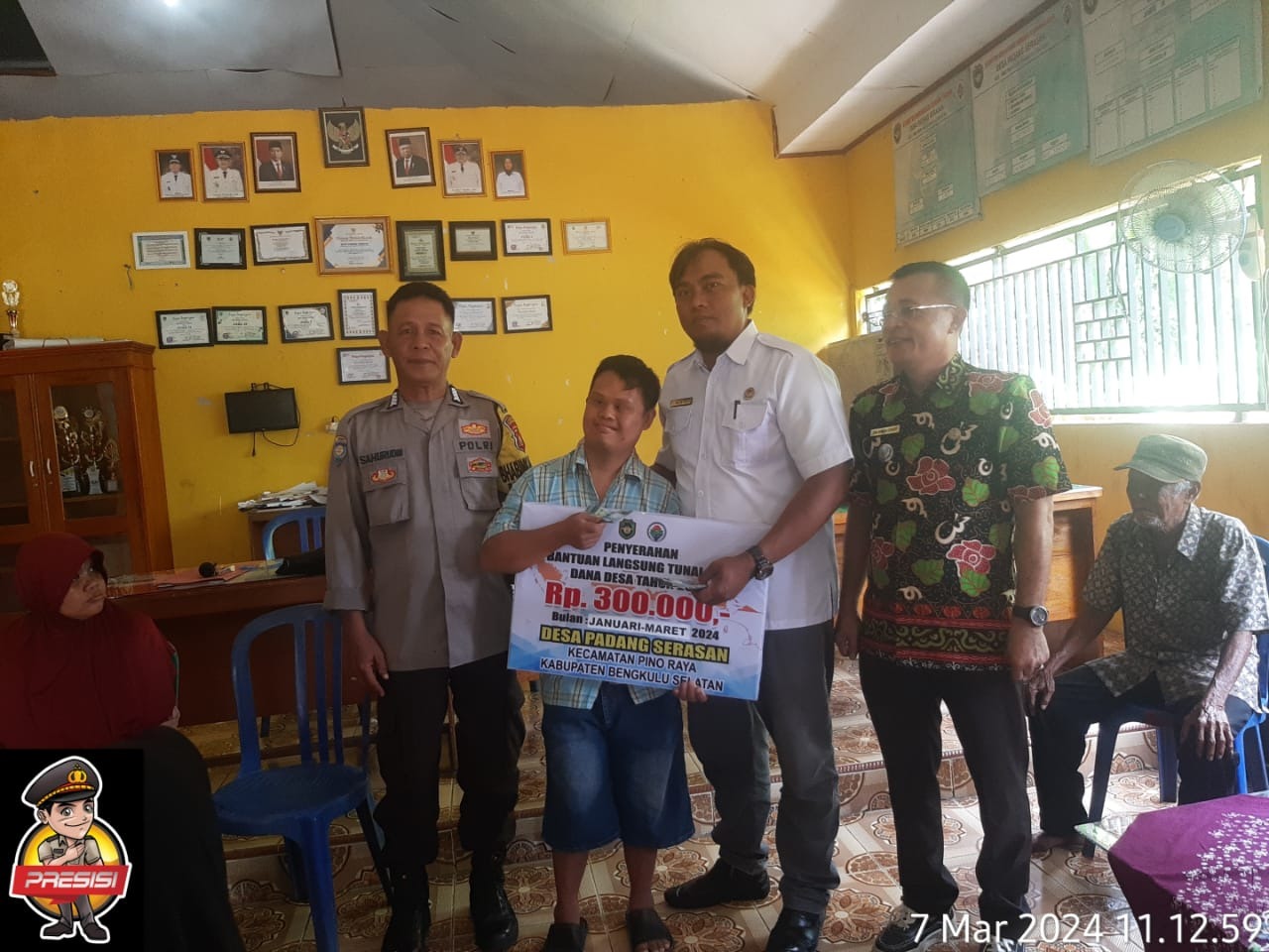 Bengkulu Selatan, – Polsek Pino Raya Polres Bengkulu Selatan Polda Bengkulu, Bhabinkamtibmas Polsek Kota Manna Bripka Sahurudin menghadiri kegiatan Penyaluran BLT-DD Di Desa Padang Serasan kecamatan Pino Raya Kabupaten Bengkulu Selatan, Kamis (07/03/24).