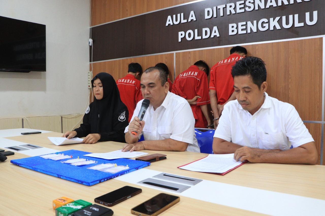 Wadir Resnarkoba Polda Bengkulu AKBP Tonny Kurniawan S.I.K., saat menggelar konferensi pers yang didampingi juga oleh Paur Pensat Subdit Penmas Bidhumas Polda Bengkulu Iptu Desty mengatakan penangkapan pelaku berawal diperoleh informasi dari masyarakat bahwa di jalan Kebun Indah 10 Kelurahan Sukarami Kecamatan Selebar sering menjadi tempat penyalahgunaan atau transaksi Narkotika, Menindaklanjuti informasi tersebut personil Subdit I melakukan penyelidikan mendalam dan pada Hari Kamis Tanggal 22 Februari 2024 Pukul 06.20 WIB dilakukan penangkapan dan penggeledahan terhadap terduga pelaku.”Bersama dengan pelaku diperoleh barang bukti berupa 2 (dua) paket Narkotika jenis Ganja, 1 (satu) linting sisa ganja, 1 (satu) kotak kertas papir, uang sebesar Rp.47.000, 1 (satu) Unit HP, 1 (satu) buah tas,” ungkap Wadir Resnarkoba, Kamis (21/03/24).Ditambahkan Wadir Resnarkoba terduga pelaku akan dijerat Pasal 114 Ayat (1) Jo Subs Pasal 112 Ayat (1) UU Nomor 35 Thn 2009 Tentang Narkotika dengan ancaman Pidana Penjara Paling Singkat 4 Thn, Paling Lama 12 Thn.