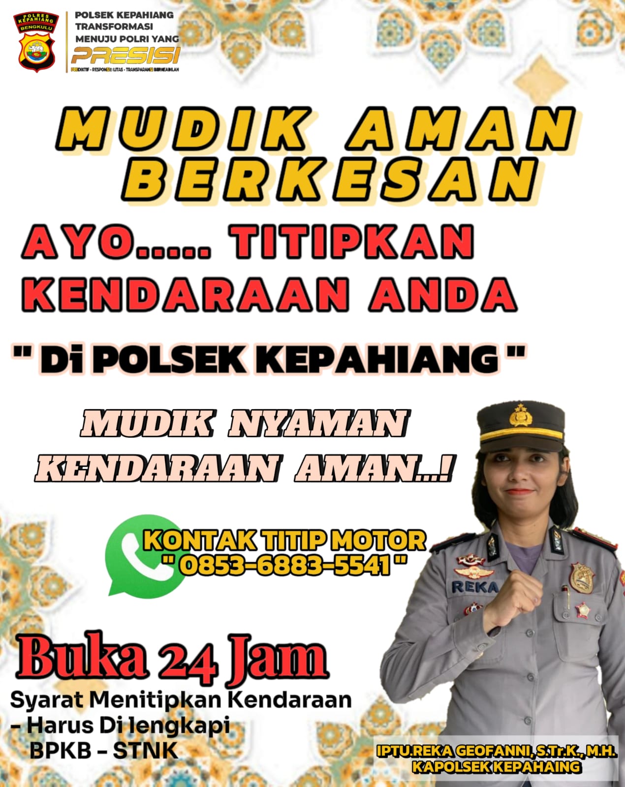 Kapolres Kepahiang, AKBP Eko Munarianto, S.I.K mengatakan, ada sejumlah syarat yang harus dipenuhi warga yang ingin menitipkan kendaraan roda duanya. Pertama, menyerahkan fotocopy Surat Tanda Nomor Kendaraan (STNK) dan fotocopy KTP pemilik kendaraan.Kapolres Kepahiang mengatakan tidak ada kuota yang ditetapkan, selama lahan parkir masih tersedia, warga dipersilakan untuk menitipkan kendaraannya. Penitipan ini gratis, tidak dipungut biaya.Kapolres kepahiang menjelaskan kendaraan yang ditinggalkan di rumah saat mudik Lebaran berbahaya atau bisa berpotensi mengundang tindak kejahatan. Sehingga, pihaknya menyarankan agar para masyarakat yang akan pulang kampung untuk bisa menitipkan motornya di Polsek-Polsek terdekat.
