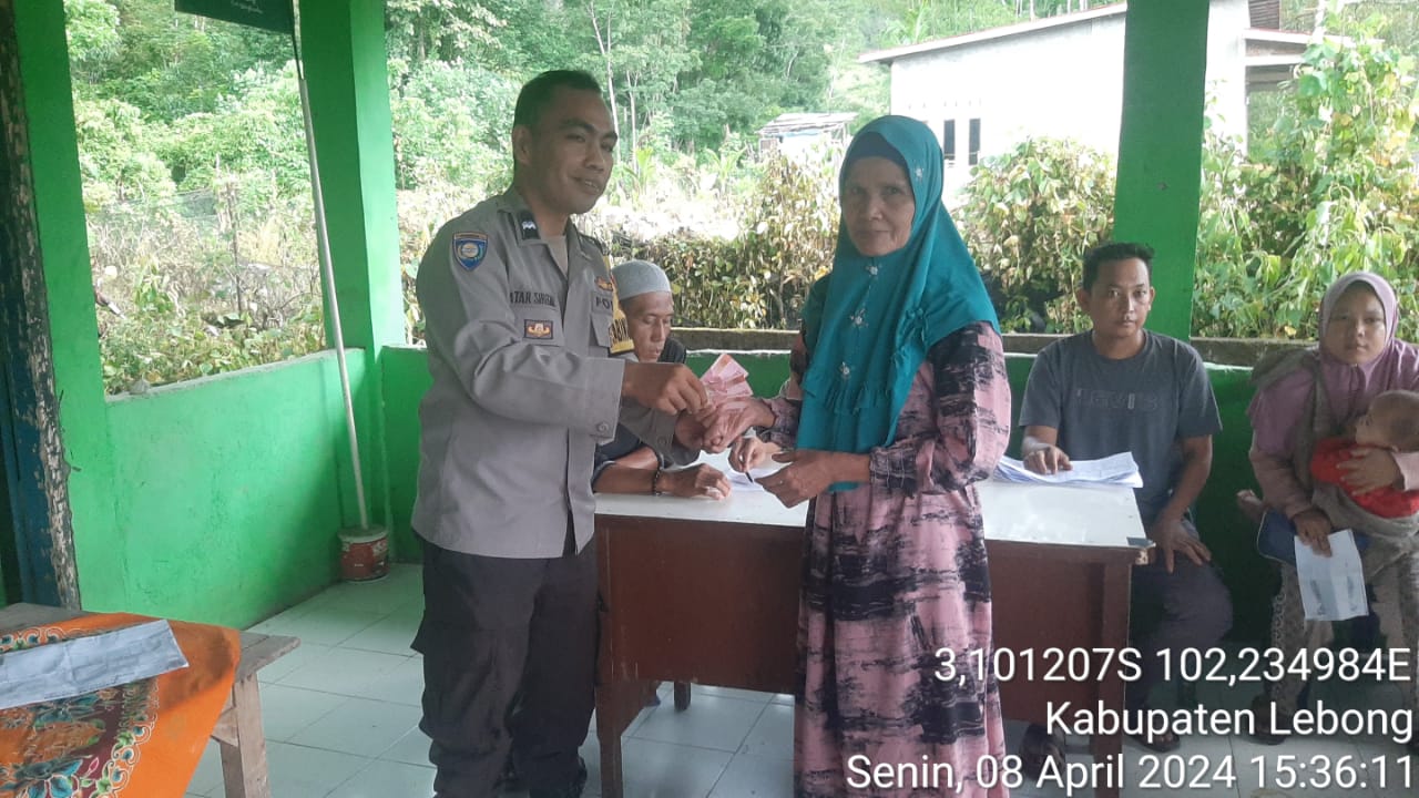 Lebong –  Bhabinkamtibmas Polsek Lebong Utara Polres Lebong Polda Bengkulu, Aipda Ali Akhtar Siregar, menghadiri kegiatan penyaluran BLT DD Bulan April TA 2024, di Desa Embong Kecamatan Uram Jaya, Kabupaten Lebong, Senin (8/4/2024).