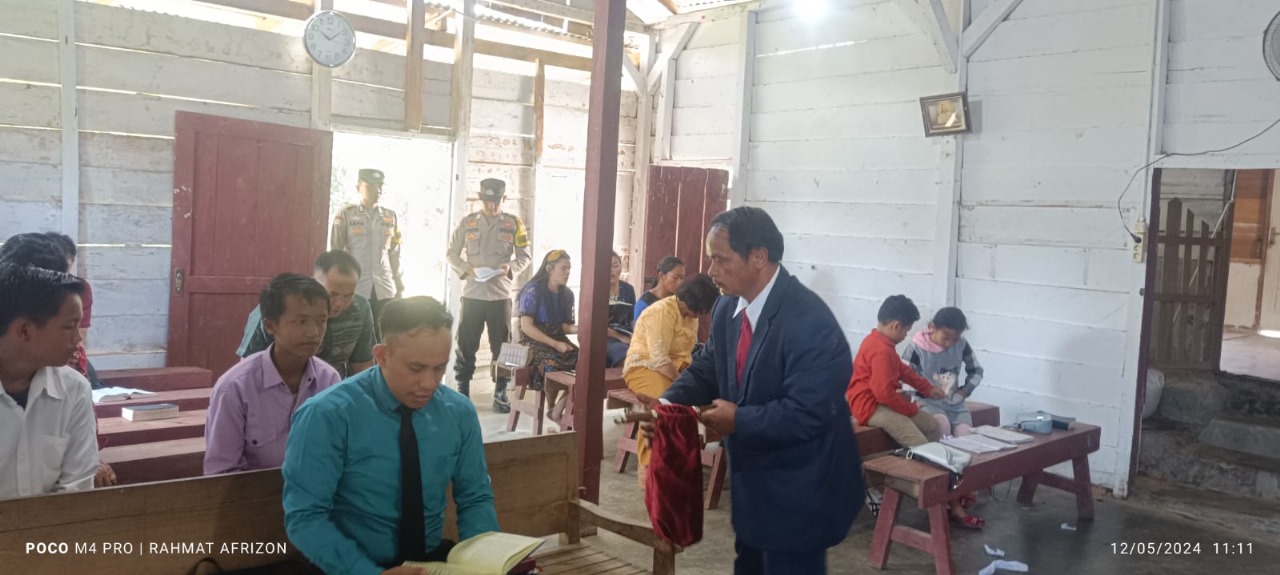 Kaur – Personel Polsek Kaur Selatan Polres Kaur Polda Bengkulu Bripka Rachmat Afrizon berserta Brigpol Agus Wijaya dan Bripda Ahmat Iqbalsyah melaksanakan Pengamanan Ibadah Gereja Umat Kristiani di Pospel HKBP Pondok Pusaka di Desa Padang Petron Kec. Kaur Selatan Kabupaten Kaur.