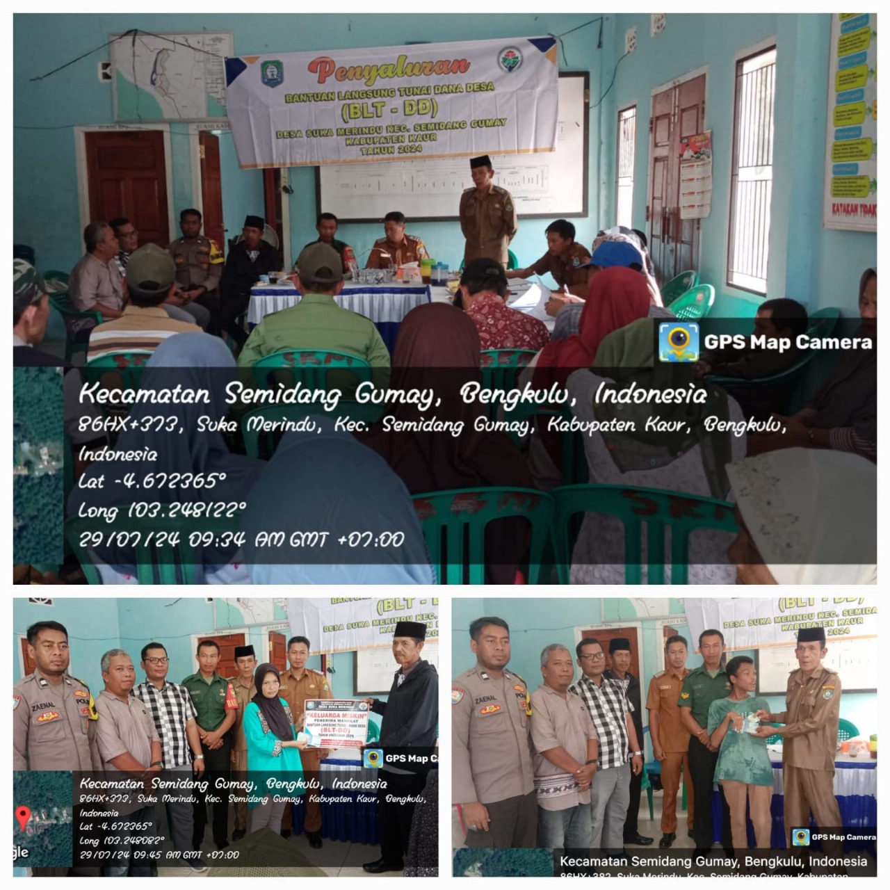 Adapun kegiatan tersebut dihadiri Camat Semidang Gumai Suhardi, S.IP, Kades, Ketua BPD beserta anggota, Babinsa, Bhabinkamtibmas Aipda Moch Zaenal Arifin, S.Sos, pendamping Desa serta warga yang berhak menerima BLT sebanyak 7 orang Keluarga penerima manfaat (KPM).
