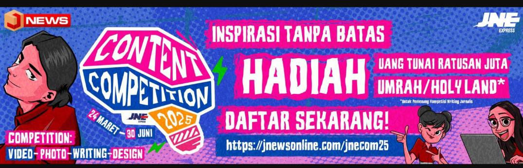 JNE Content Competition 2025 akan berlangsung mulai dari tanggal 24 Maret hingga 30 Juni 2025, dengan hadiah berupa uang tunai ratusan juta rupiah serta kesempatan diberangkatkan Umrah atau Holy Land. Kompetisi ini merupakan bagian dari kontribusi JNE dalam menciptakan talenta baru yang memiliki kemampuan kreativitas yang dituangkan melalui karya penulisan, desain, fotografi, dan videografi. Kompetisi ini dapat diikuti oleh berbagai kalangan, mulai dari jurnalis, masyarakat umum, pelajar & mahasiswa, hingga karyawan JNE. Pendaftaran dapat dilakukan melalui tautan berikut: https://jnewsonline.com/jnecom25/ .