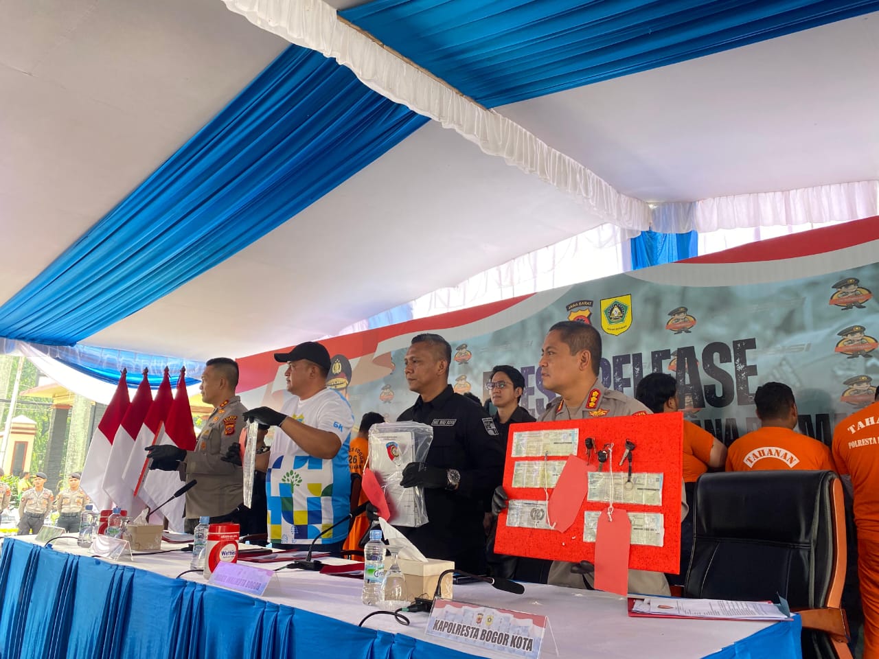 Konferensi pers digelar di halaman Mako Polres Bogor, Jalan Tegar Beriman, Cibinong, Jumat (9/5/2025). Barang bukti dihadirkan dalam konferensi pers tersebut.