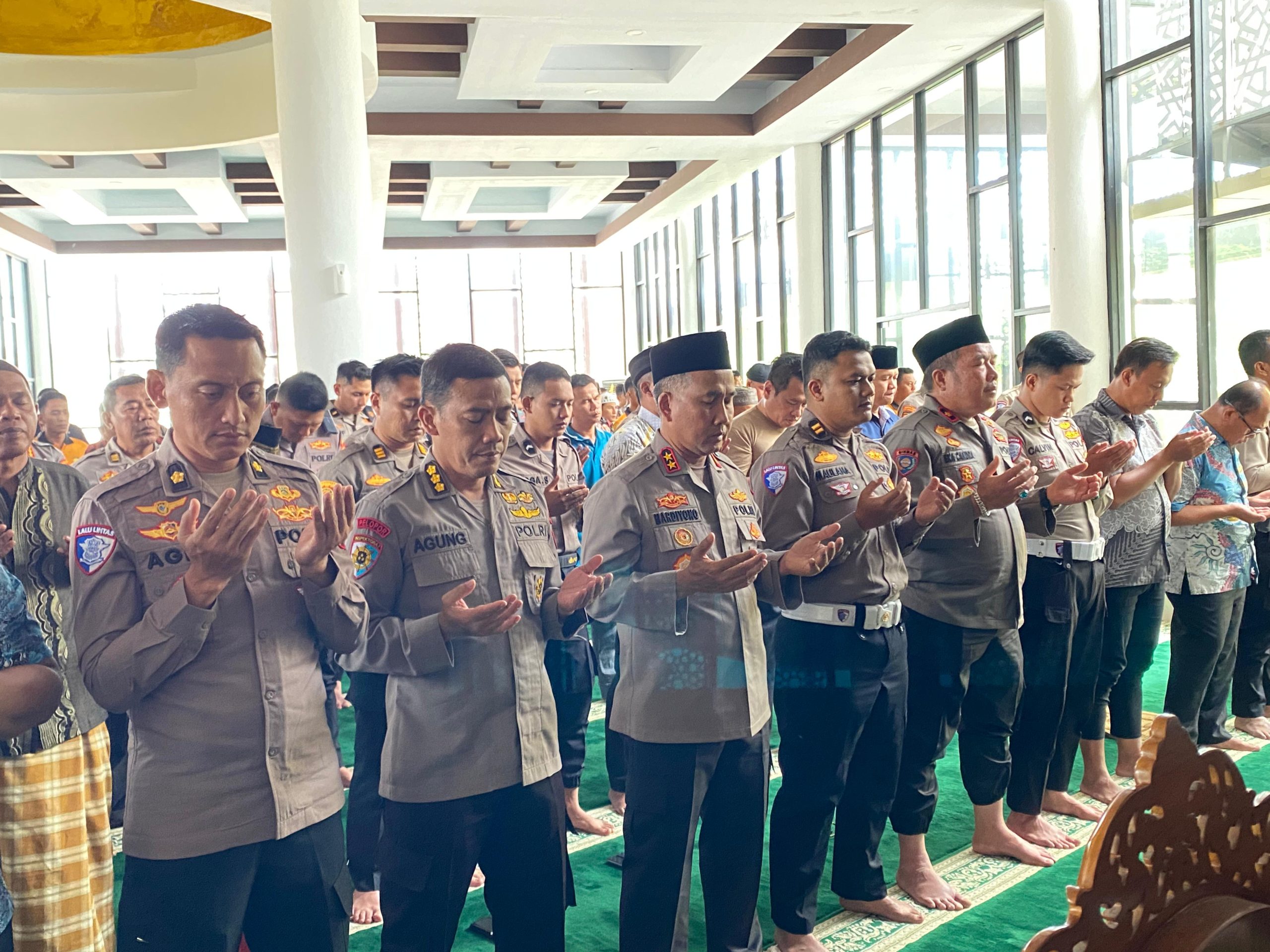 Bengkulu, 29 Agustus 2025 – Kapolda Bengkulu, Irjen Pol Mardiyono, S.I.K., M.Si. dan Pejabat Utama (PJU ) Polda Bengkulu serta seluruh personel Polda Bengkulu melaksanakan shalat gaib di Masjid Al-Amin Polda Bengkulu pada hari Jumat, 29 Agustus 2025.