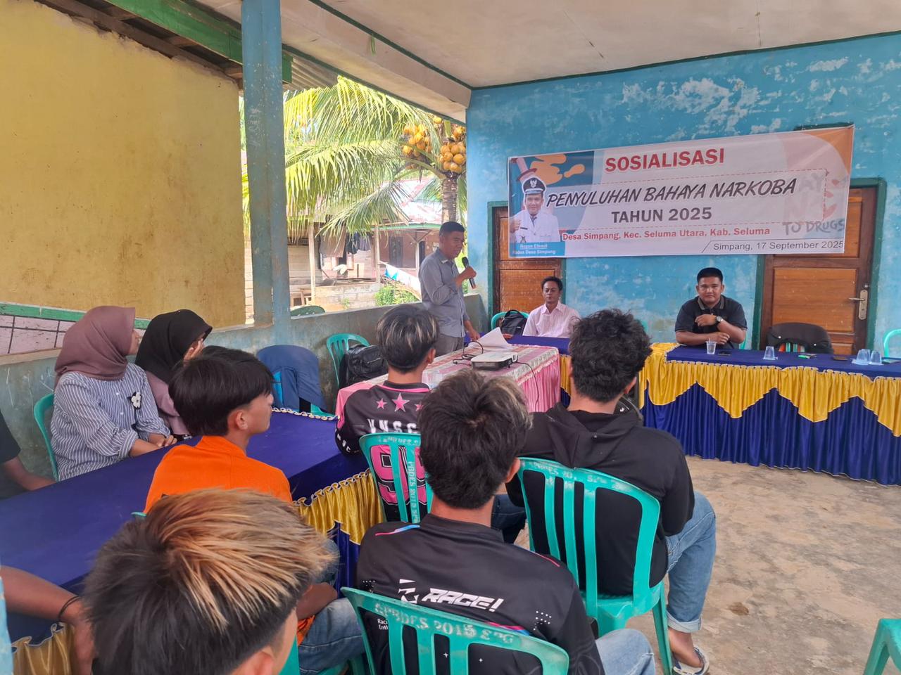 Seluma – Kegiatan Sat Resnarkoba Polres Seluma dipimpin oleh Kaur Bin Ops Ipda Saroha Silalahi melaksanakan kegiatan upaya Pencegahan dan Penanggulangan Tindak Pidana Narkotika, berupa Sosialisasi dan Penyuluhan Hukum bahaya Narkoba kepada para muda-mudi serta warga Desa Simpang Kec.Seluma Utara Kab.Seluma, Rabu (17/09/2025) pukul 09.00 Wib S.d Selesai di Desa Simpang Kec.Seluma Utara Kab.Seluma .