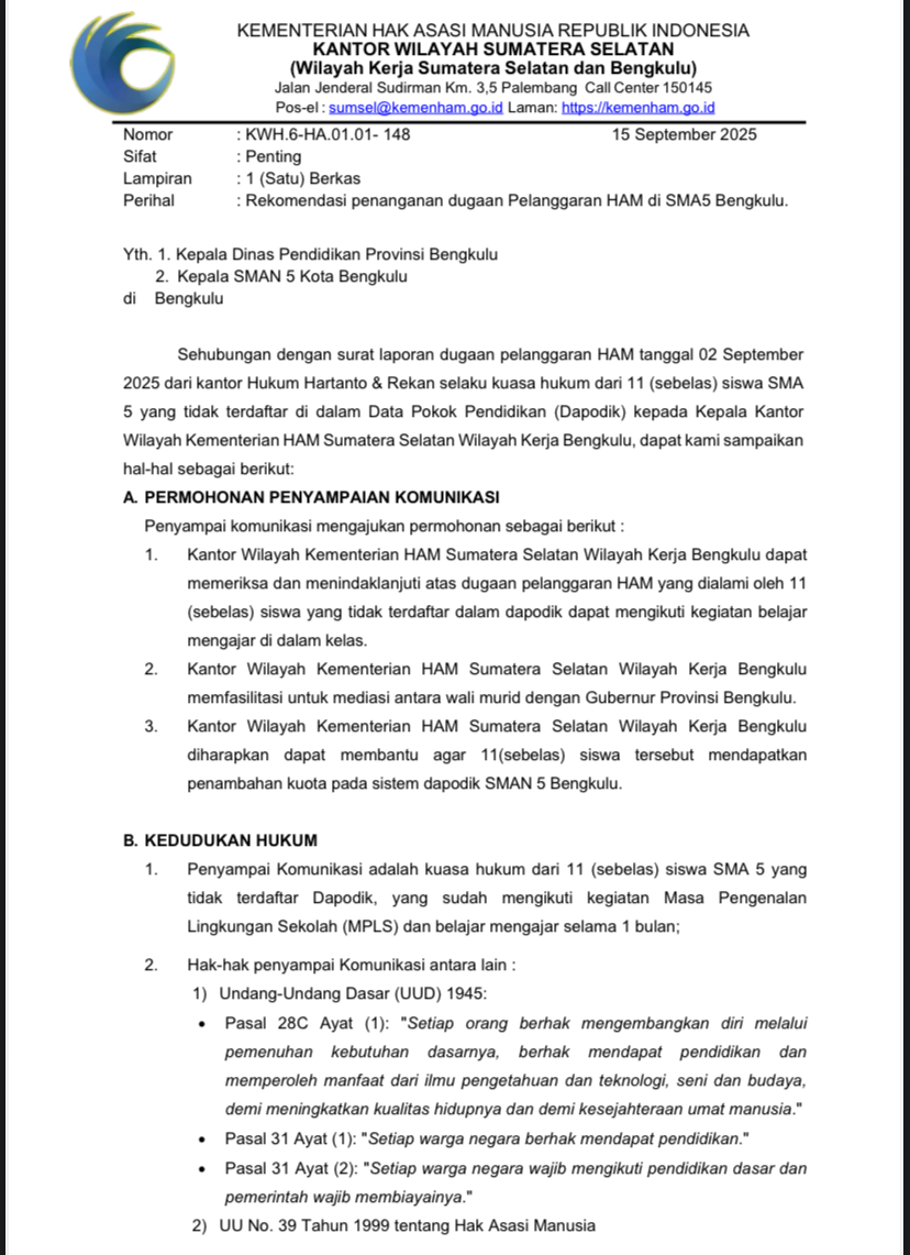 Bengkulu, Tintabangsa- ComKementerian Hukum dan Hak Asasi Manusia (Kemenkumham) melalui Kantor Wilayah Sumatera Selatan, yang menaungi wilayah kerja Bengkulu, resmi mengeluarkan rekomendasi terkait dugaan pelanggaran hak asasi manusia dalam kasus 11 siswa SMAN 5 Bengkulu yang tidak tercatat di Data Pokok Pendidikan (Dapodik).