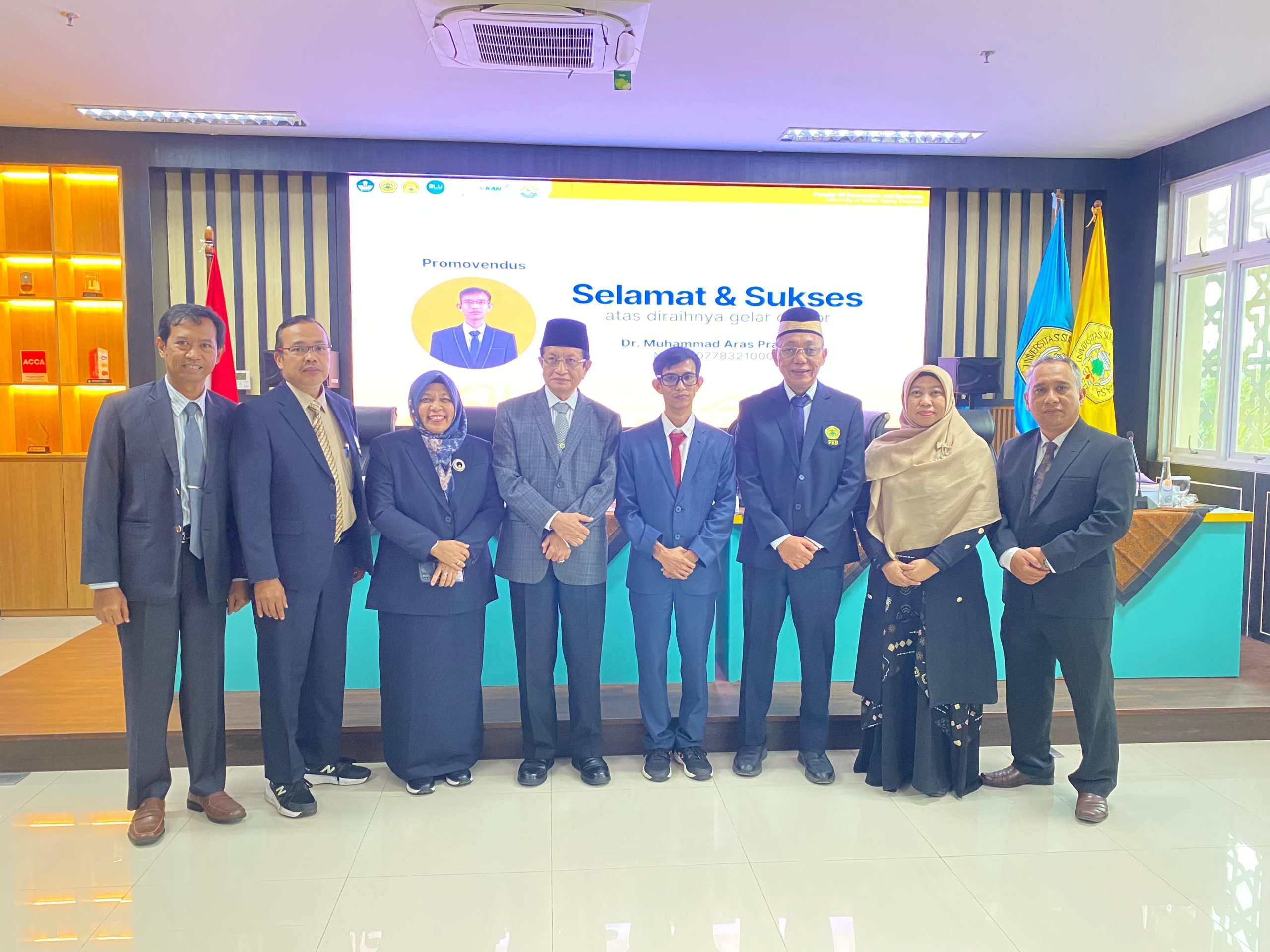 Serang, 27 September 2025 – Fakultas Ekonomi dan Bisnis Universitas Sultan Ageng Tirtayasa (FEB UNTIRTA) menyelenggarakan sidang terbuka promosi doktor Ilmu Akuntansi atas nama Dr. Muhammad Aras Prabowo, S.E., M.Ak dengan disertasi berjudul “Nilai-Nilai Teseng dalam Konstruksi Akuntabilitas di Sektor Pertanian”. Sidang berlangsung di Ruang Teleconference Lt. 3 FEB UNTIRTA pada Sabtu (27/9) pukul 13.00–15.00 WIB, dipimpin oleh Prof. Dr. Tubagus Ismail, SE., MM., Ak., CA., CMA., Dekan FEB UNTIRTA, dengan sekretaris sidang Dr. Munawar Muchlish, Ak., M.Si., CA., ACPA., ASEAN CPA., CAPM.