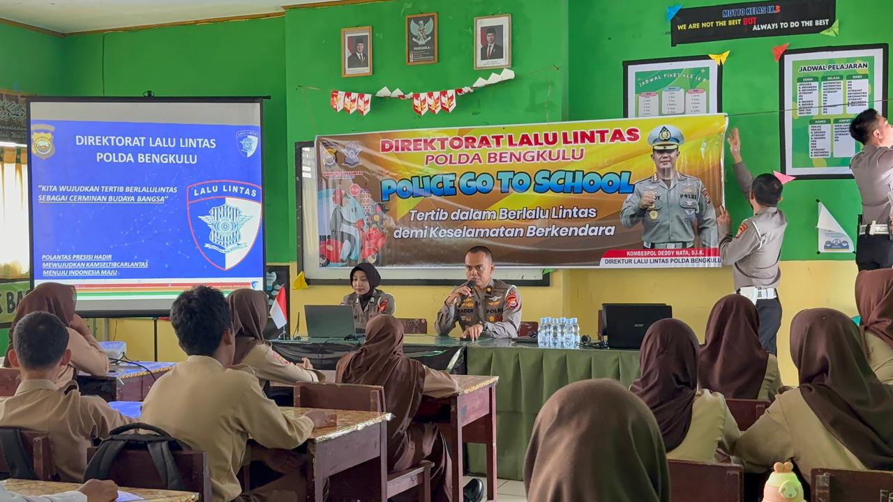 Bengkulu – Upaya menciptakan generasi muda yang sadar dan tertib berlalu lintas terus dilakukan oleh Ditlantas Polda Bengkulu. Salah satunya diwujudkan melalui program Police Goes to School yang kali ini digelar di SMPN 9 Kota Bengkulu, Rabu (01/10/2025).