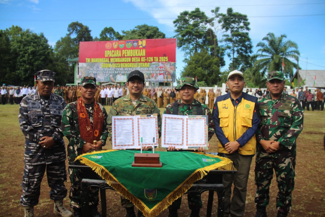 Bengkulu Utara – Upacara pembukaan TNI Manunggal Membangun Desa (TMMD) ke-126 Tahun 2025 Kodim 0423/Bengkulu Utara digelar dengan khidmat di Lapangan Kecamatan Hulu Palik, Kabupaten Bengkulu Utara, pada Rabu (8/10/2025). Kegiatan ini mengusung tema “Dengan Semangat TMMD Mewujudkan Pemerataan Pembangunan dan Ketahanan Nasional di Wilayah”, sebagai wujud nyata sinergi antara TNI, Pemerintah Daerah, dan masyarakat dalam mempercepat pembangunan di desa.