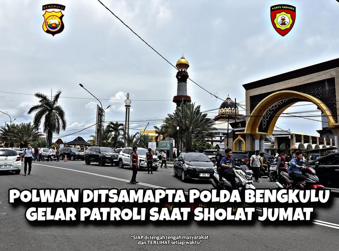 BENGKULU – Personel Polwan Direktorat Samapta Polda Bengkulu yang dipimpin oleh Kasubdit Gasum Kompol Tatar Ihsan, S.H., melaksanakan patroli menggunakan kendaraan roda dua (R.2) di sejumlah titik wilayah Kota Bengkulu, Jumat (17/10/2025). Kegiatan ini dilakukan bersamaan dengan pelaksanaan ibadah salat Jumat, dengan rute pengamanan meliputi Masjid Raya Baitul Izzah dan Masjid At Taqwa, dua masjid besar yang menjadi pusat aktivitas ibadah masyarakat.