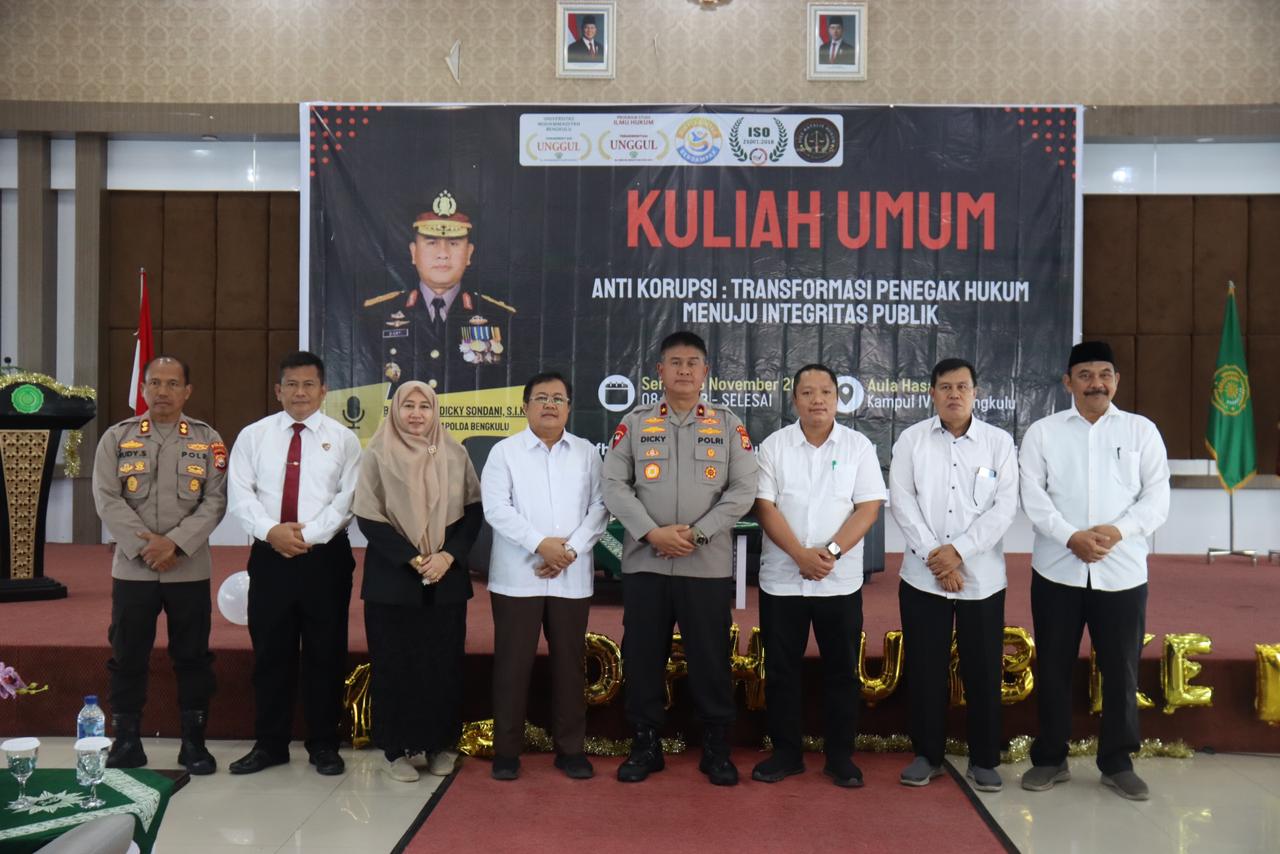 BENGKULU – Wakapolda Bengkulu, Brigjen Pol. Dicky Sondani S.I.K., M.H., menjadi narasumber dalam Kuliah Umum dengan tema “Anti Korupsi: Transformasi Penegak Hukum Menuju Integritas Publik” di Universitas Muhammadiyah Bengkulu (UMB) pada Senin, 3 November 2025. Kegiatan ini dilaksanakan dalam rangka Dies Natalis Fakultas Hukum UMB ke-17 Tahun 2025.