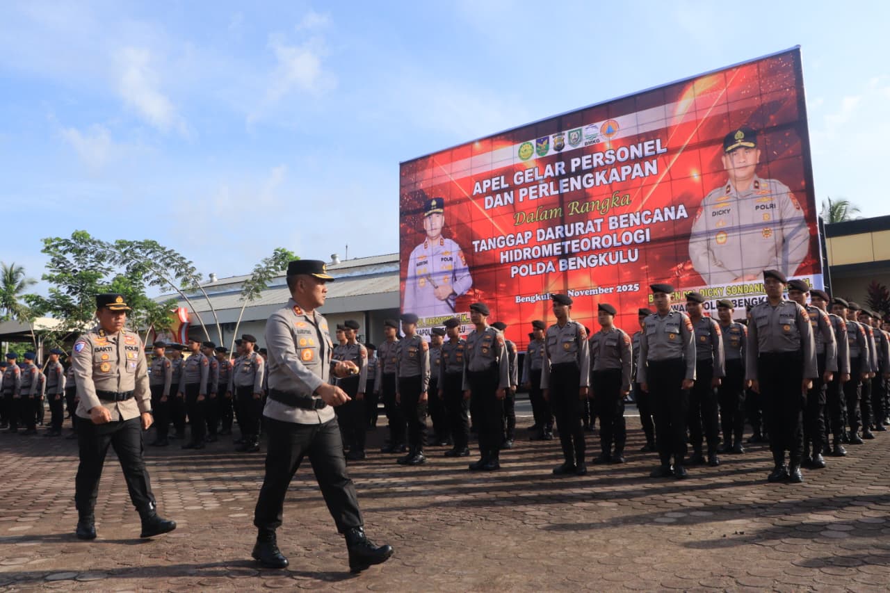 Bengkulu – Dalam rangka mengantisipasi potensi bencana hidrometeorologi di wilayah Provinsi Bengkulu, Polda Bengkulu menggelar Apel Personel dan Perlengkapan Tanggap Darurat Bencana di Lapangan Anton Soejarwo, Rabu (5/11/2025). Apel yang dimulai pukul 07.00 WIB ini dipimpin langsung oleh Kapolda Bengkulu Irjen Pol. Mardiyono, S.I.K., M.Si., dan dihadiri oleh Wakapolda Bengkulu Brigjen Pol. Dicky Sondani, S.I.K., M.H., Ketua DPRD Provinsi Bengkulu, Sekda Provinsi Bengkulu, serta perwakilan Forkopimda dan stakeholder terkait.