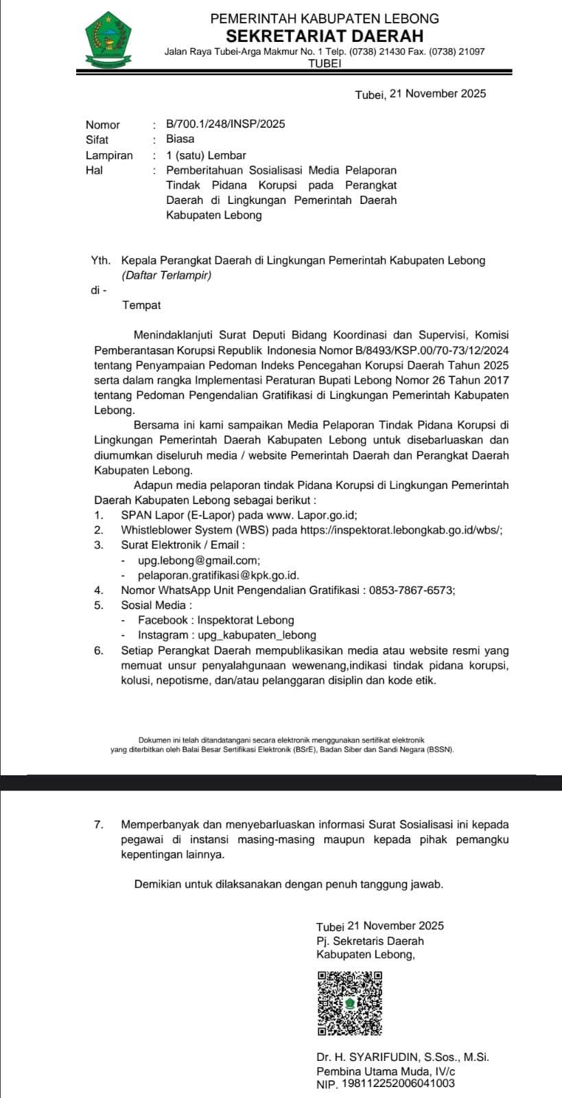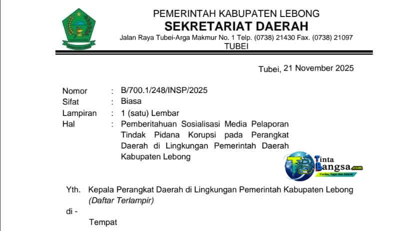 Informasi tersebut tertuang dalam surat resmi Sekretariat Daerah Kabupaten Lebong tertanggal 21 November 2025, yang ditandatangani oleh Pj Sekretaris Daerah Kabupaten Lebong, Dr. H. Syarifudin, S.Sos., M.Si. Surat tersebut juga dipublikasikan melalui akun Facebook Kominfo Kabupaten Lebong pada 24 November 2025.
