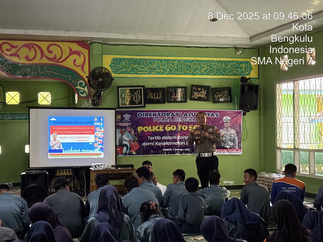 Bengkulu – Ditlantas Polda Bengkulu melalui Subdit Kamsel melaksanakan kegiatan penyuluhan dan sosialisasi tentang tertib berlalu lintas di SMA Negeri 7 Kota Bengkulu pada Senin,8 Desember 2025. Kegiatan ini bertujuan untuk memberikan edukasi kepada siswa-siswi tentang pentingnya tertib berlalu lintas sebagai cerminan budaya bangsa dan keselamatan di jalan raya.