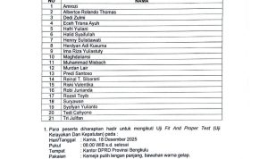 Bengkulu,Tintabangsa.com- Sebanyak 21 peserta yang dinyatakan lulus seleksi tahap Computer Assisted Test (CAT) mengikuti tahapan uji kelayakan dan kepatutan (fit and proper test) di Gedung DPRD Provinsi Bengkulu, Kamis (18/12/2025).