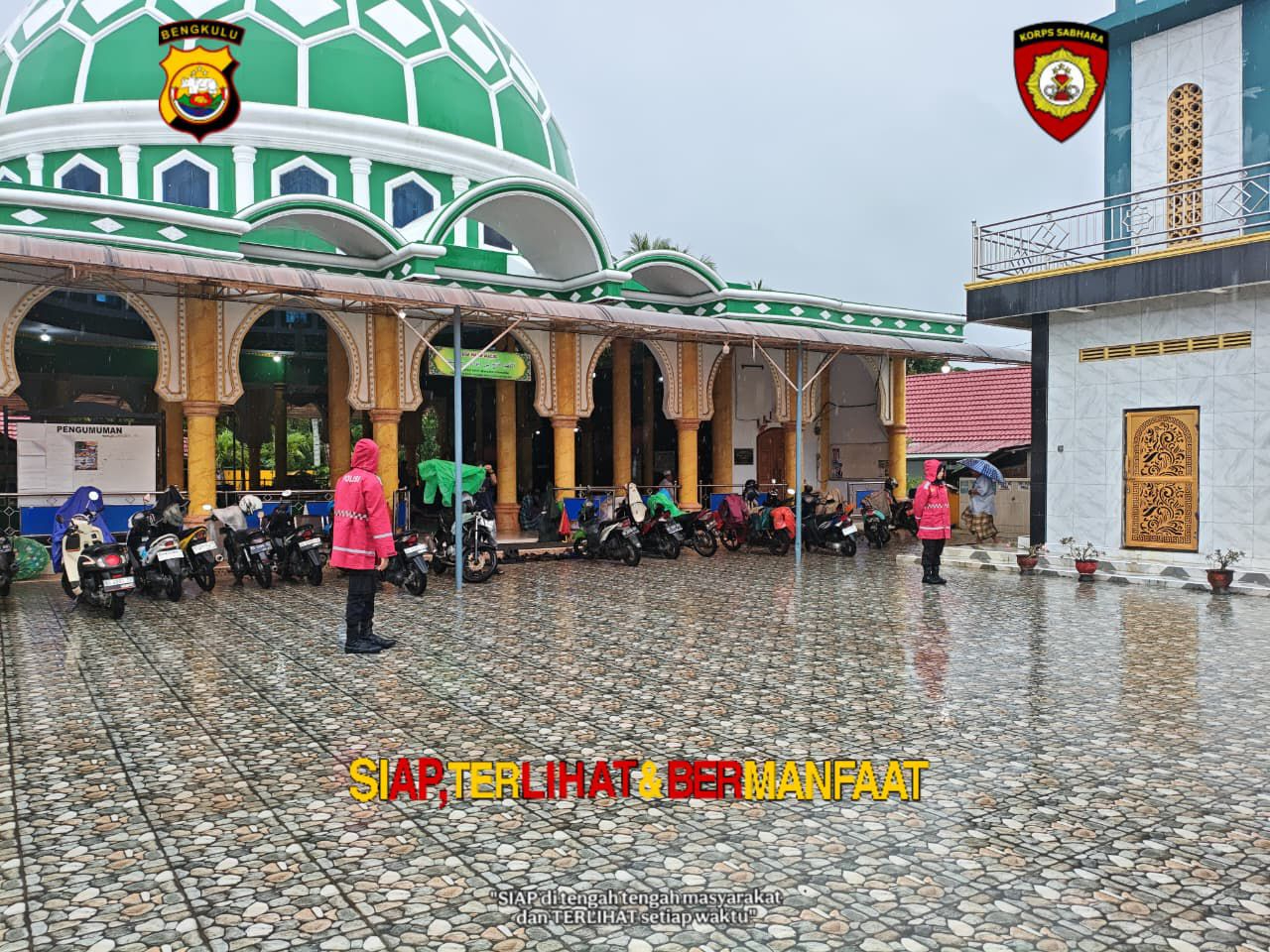 Walaupun Cuaca Hujan Anggota piket Pos Shelter Ditsamapta Polda Bengkulu dan juga Polwan Ditsamapta Polda Bengkulu melaksanakan pengamanan sholat jumat dan juga yang bertugas melakukan pemantauan di sekitar masjid untuk memastikan situasi tetap aman dan kondusif tidak terjadinya tindak pidana 3C ( Curat , Curas , dan Curanmor) Dengan kehadiran polisi di lokasi, diharapkan dapat memberikan rasa aman dan nyaman kepada masyarakat bahwa keamanan dan ketertiban umum tetap terjaga dalam pelaksanakn Ibadah Sholat Jumat.