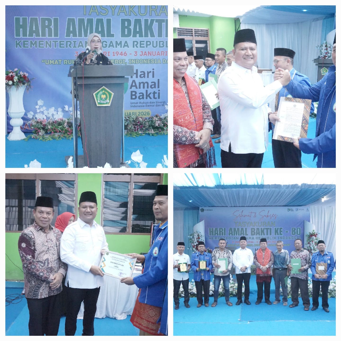 Pada kesempatan tersebut, turut dilakukan penyerahan piagam penghargaan dalam rangka HAB ke-80 Tahun 2026 oleh Wakil Bupati Asahan bersama Forkopimda dan Kepala Kantor Kementerian Agama Kabupaten Asahan kepada sejumlah penerima penghargaan, antara lain kategori Humas, User Champion EMIS Terbaik TP 2025/2026 Semester Ganjil, Desa Binaan Berdampak, serta kepada ATR/BPN Kabupaten Asahan atas dedikasinya dalam percepatan penerbitan sertifikat tanah MAN Insan Cendekia Asahan.(surya)