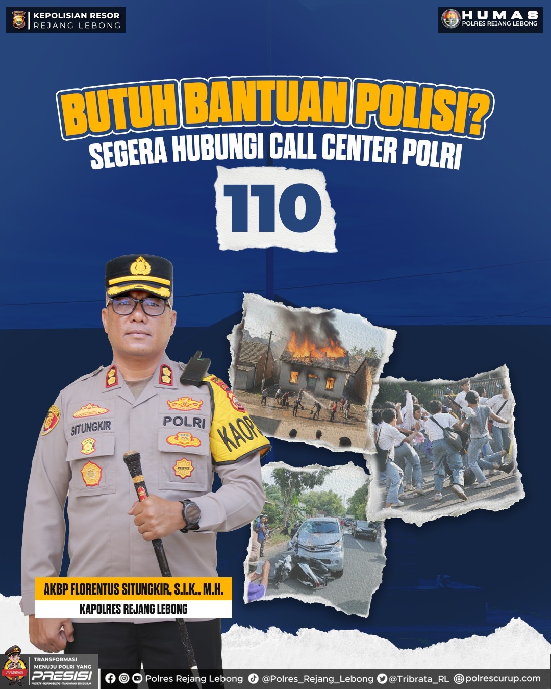 Rejang Lebong — Polres Rejang Lebong mengimbau seluruh masyarakat untuk tidak ragu meminta bantuan kepolisian dengan memanfaatkan Call Center Polri 110 apabila menghadapi situasi darurat atau membutuhkan kehadiran petugas kepolisian.
