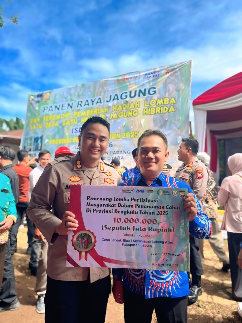 Pada kesempatan yang sama, Kapolres Lebong mendampingi Kepala Desa Tabeak Blau I, Dedi Dewinsyah, S.Sos., yang menerima hadiah sebagai pemenang Lomba Partisipasi Masyarakat dalam Penanaman Cabai tingkat Provinsi Bengkulu. Penghargaan tersebut diserahkan langsung oleh Gubernur Bengkulu.