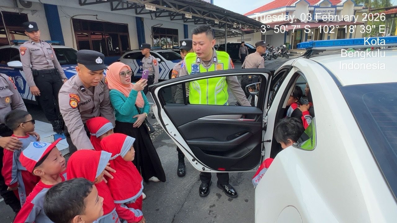 Kedatangan para siswa disambut hangat oleh personel Ditlantas Polda Bengkulu. Sejak awal kegiatan, anak-anak diajak berinteraksi langsung dengan polisi melalui berbagai aktivitas sederhana yang mudah dipahami. Mereka dikenalkan dengan tugas dasar kepolisian, khususnya peran polisi lalu lintas dalam menjaga keselamatan di jalan raya. Dengan pendekatan komunikatif dan penuh keceriaan, anak-anak terlihat antusias mengikuti setiap rangkaian kegiatan.