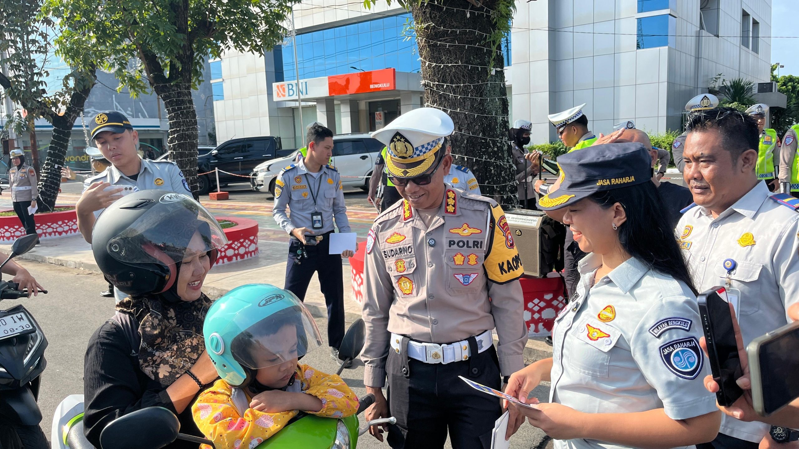 Melalui kegiatan Polantas Menyapa, para petugas memberikan sosialisasi langsung kepada pengguna jalan mengenai pentingnya mematuhi aturan lalu lintas demi keselamatan bersama. Edukasi ini disampaikan secara persuasif dan humanis kepada pengendara roda dua maupun roda empat yang melintas di kawasan tersebut.