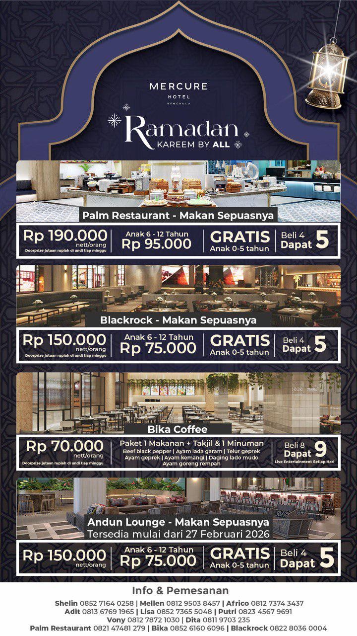 Untuk informasi dan pemesanan, masyarakat dapat menghubungi pihak Mercure Bengkulu melalui kontak yang tertera pada materi promosi.