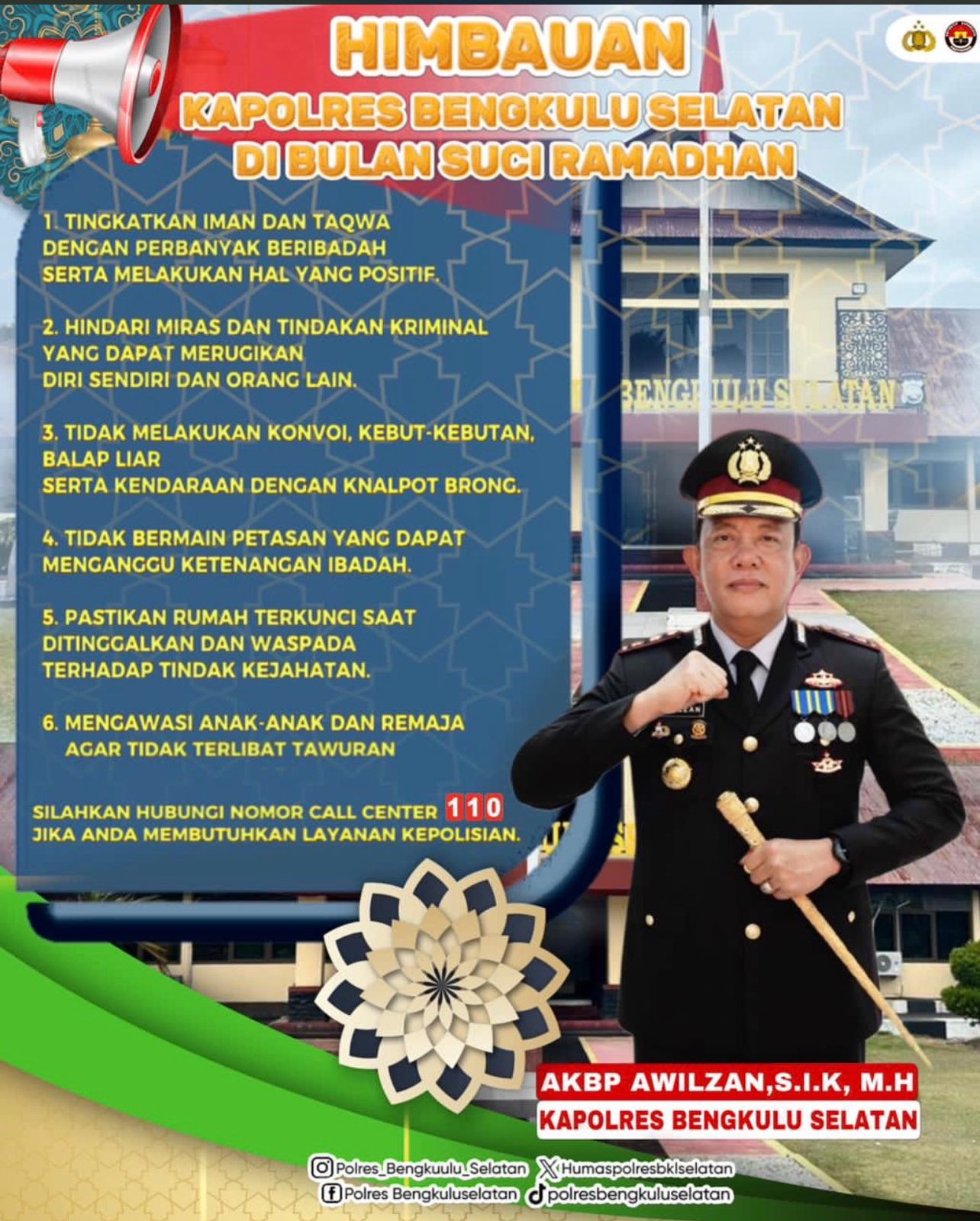 Bengkulu Selatan – Dalam rangka menjaga situasi keamanan dan ketertiban masyarakat (kamtibmas) selama Bulan Suci Ramadan, Kapolres Bengkulu Selatan AKBP Awilzan, S.I.K., M.H., menyampaikan imbauan kepada seluruh masyarakat agar bersama-sama menciptakan suasana yang aman, tertib, dan kondusif.