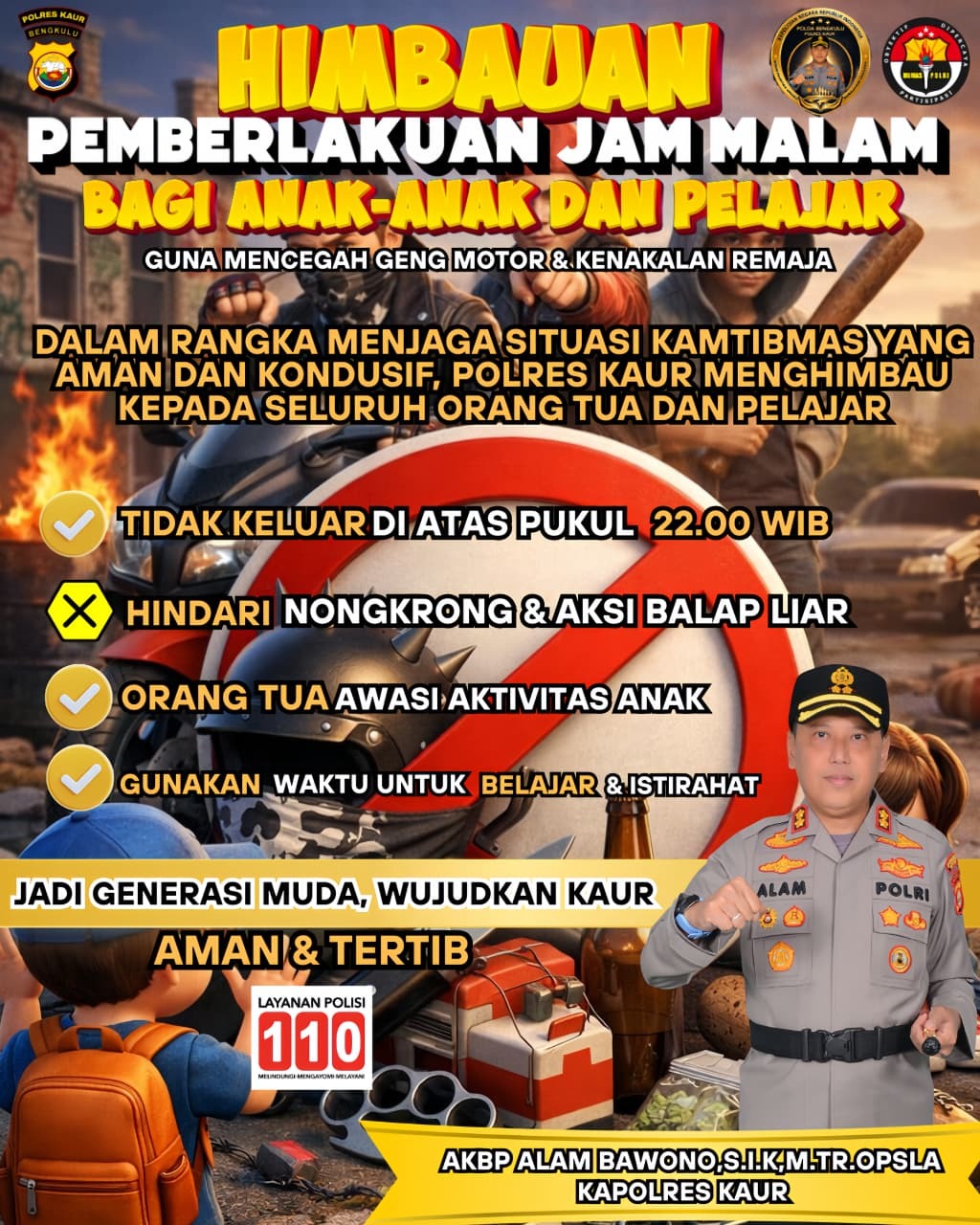 Imbauan tersebut disampaikan langsung oleh Kapolres Kaur, AKBP Alam Bawono, S.I.K., M.Tr.Opsla. Kebijakan ini bertujuan untuk mencegah maraknya aksi kenakalan remaja, seperti geng motor, balap liar, hingga aktivitas nongkrong yang berpotensi menimbulkan gangguan kamtibmas.