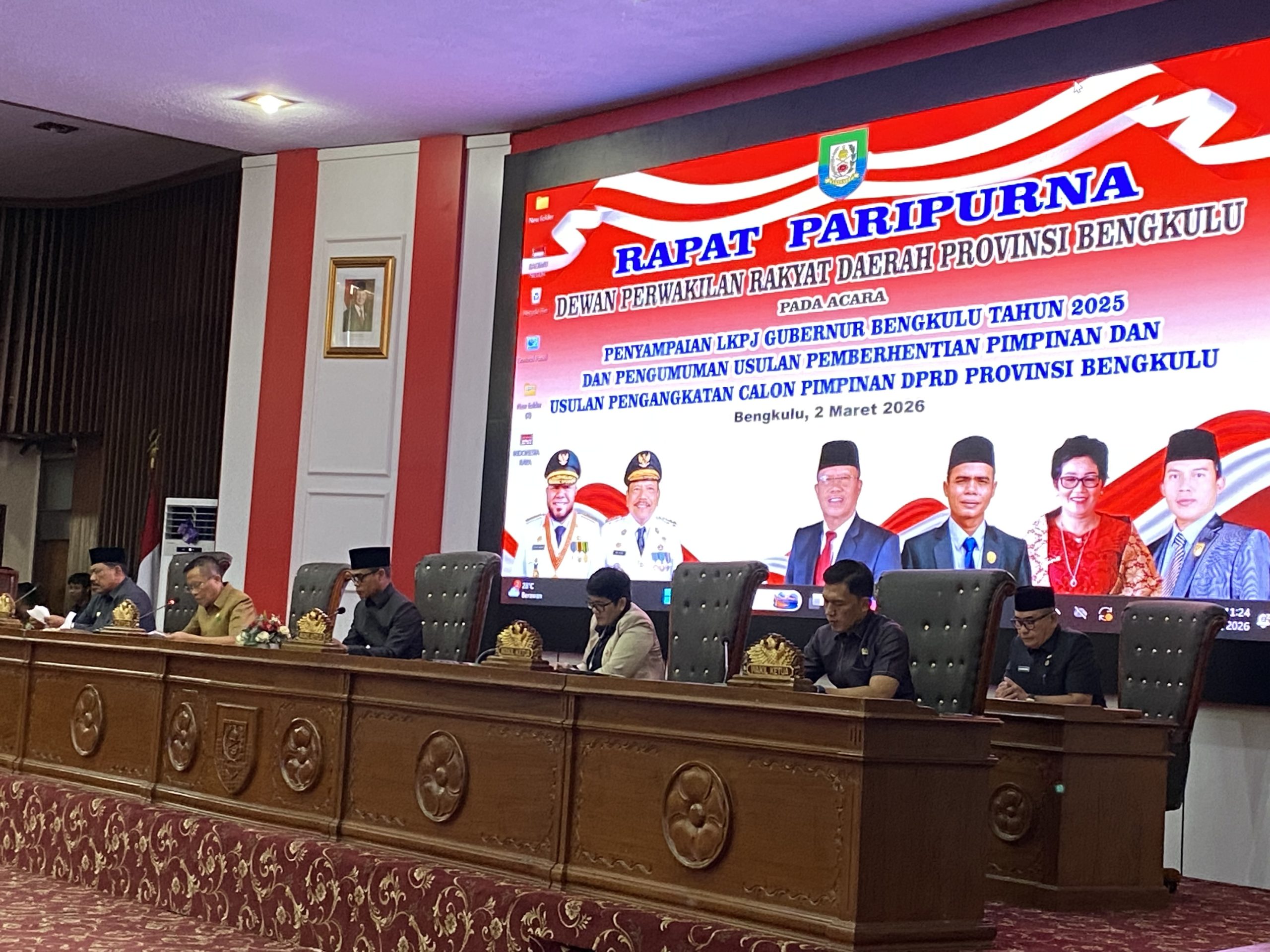 Dalam Rapat Paripurna ke-3 Masa Persidangan I Tahun 2026 yang digelar Senin (2/3/2026) di gedung DPRD Provinsi Bengkulu, terdapat dua agenda utama: penyampaian LKPJ Gubernur Bengkulu Tahun 2025 dan pengumuman usulan pemberhentian serta pengangkatan calon pimpinan DPRD.