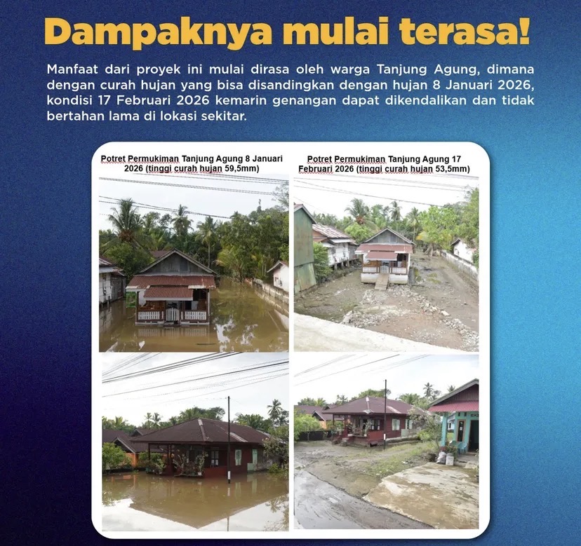 Menurut pihak BWS, keberadaan infrastruktur pengendalian banjir tersebut mulai memberikan dampak nyata bagi masyarakat. Hal ini terlihat saat curah hujan mencapai 53,5 mm pada 16 Februari 2026, di mana genangan air di kawasan Tanjung Agung masih dapat dikendalikan.