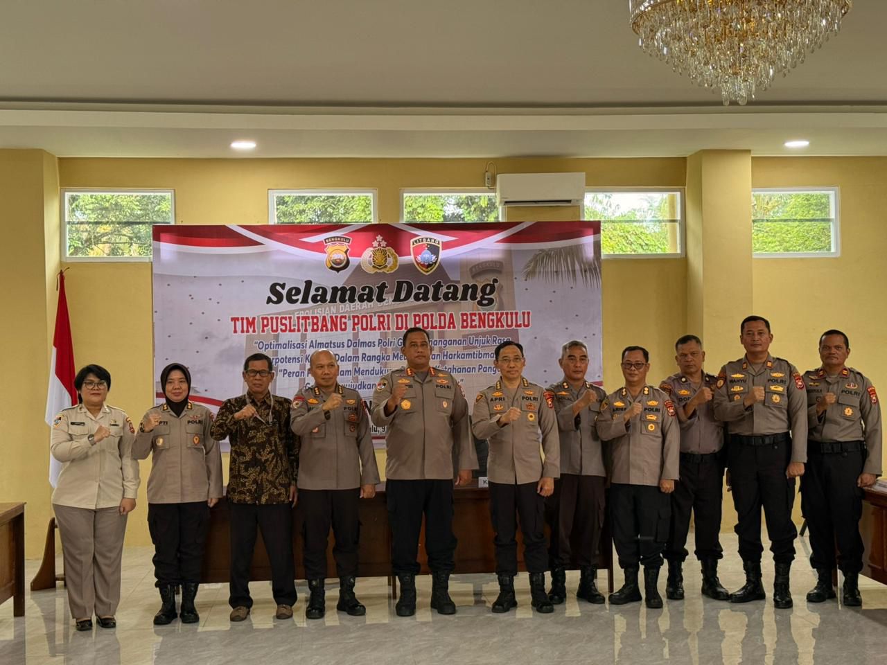 Bengkulu – Tim Puslitbang Polri yang dipimpin oleh Kombespol Hariyatmoko, S.I.K., M.H, bersama Tim melakukan kunjungan ke Polda Bengkulu pada hari ini, Senin (9/3/2026). Kunjungan ini bertujuan untuk mengoptimalkan Almatsus Dalmas Polri dalam penanganan unjuk rasa berpotensi konflik, serta meningkatkan peran Polri dalam mendukung program ketahanan pangan guna mewujudkan swasembada pangan tahun anggaran 2026.