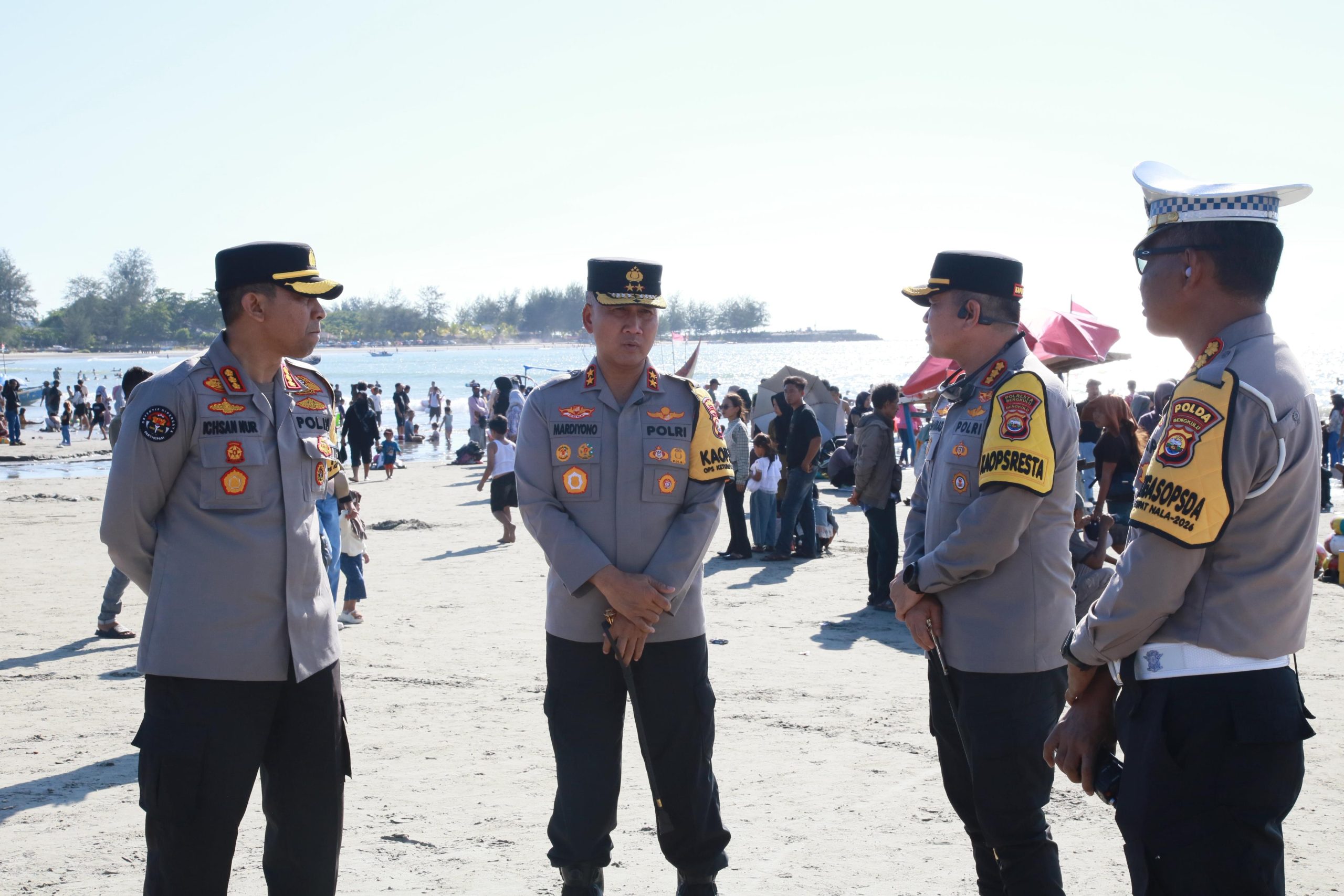 Bengkulu – Kapolda Bengkulu Irjen Pol. Mardiyono, S.I.K., M.Si. selaku Kaopsda Ketupat Nala 2026 melaksanakan peninjauan langsung situasi keamanan dan ketertiban masyarakat (Sitkamtibmas) di sejumlah objek wisata di Kota Bengkulu, Senin (23/3/2026).