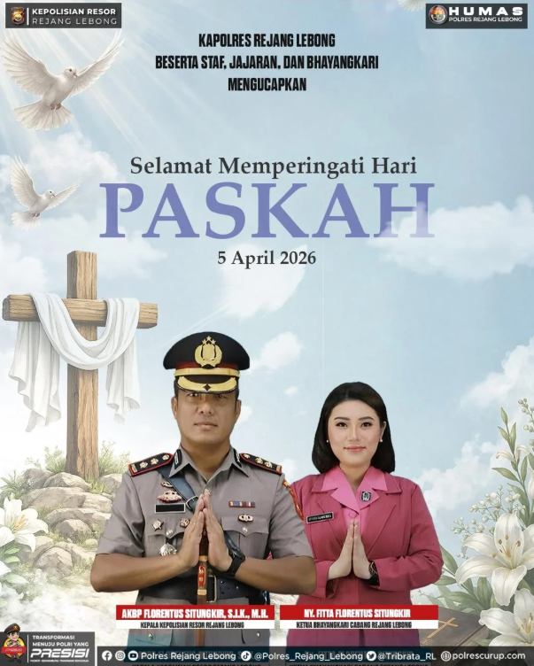 REJANG LEBONG – Menyambut Hari Raya Paskah yang jatuh pada Minggu, 5 April 2026, Keluarga Besar Kepolisian Resor (Polres) Rejang Lebong menyampaikan ucapan selamat dan doa restu kepada seluruh umat Kristiani di Kabupaten Rejang Lebong.
