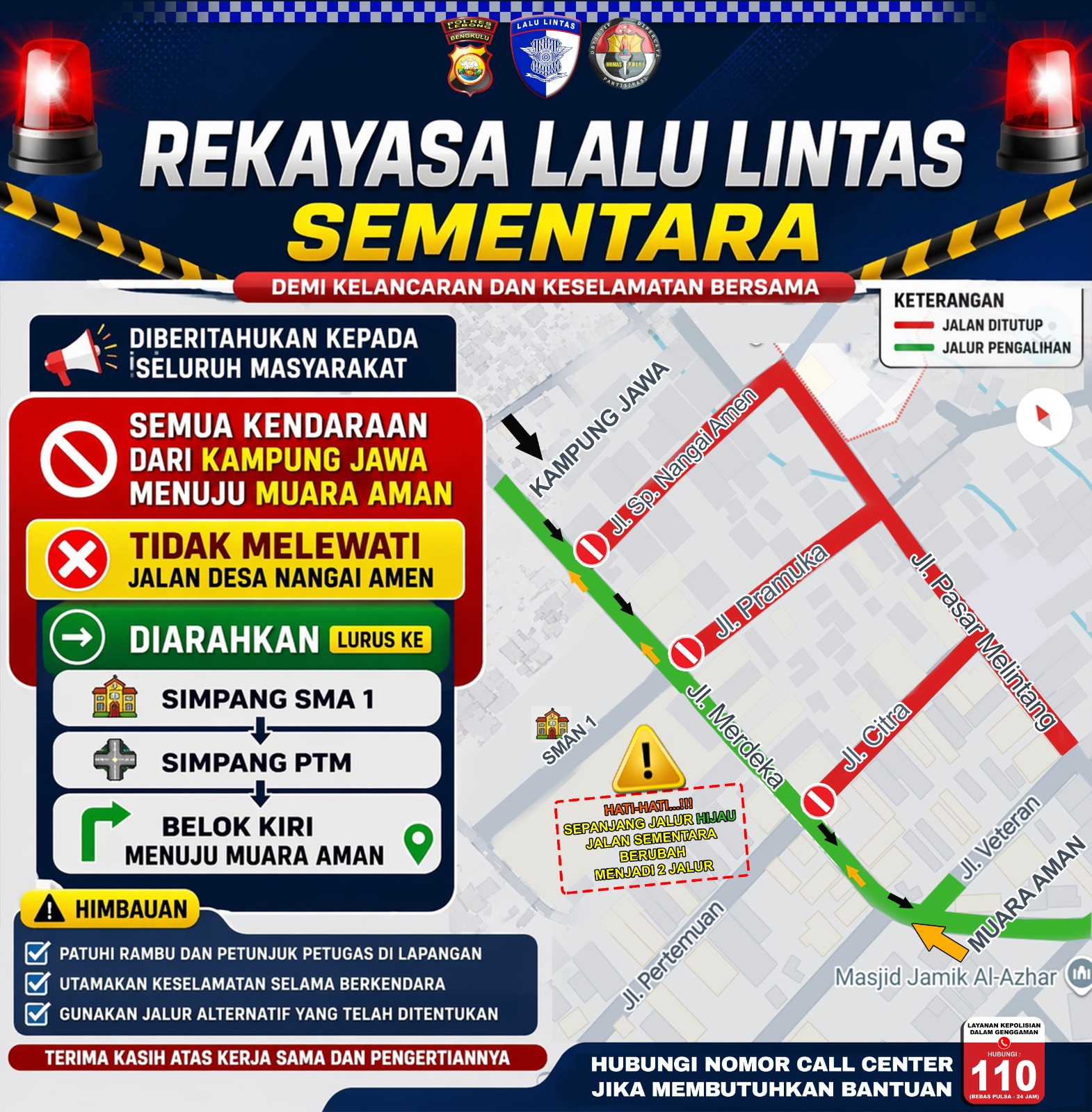“Arus lalu lintas dialihkan lurus menuju Simpang SMA 1, dilanjutkan ke Simpang PTM, kemudian belok kiri menuju Muara Aman,” jelasnya.