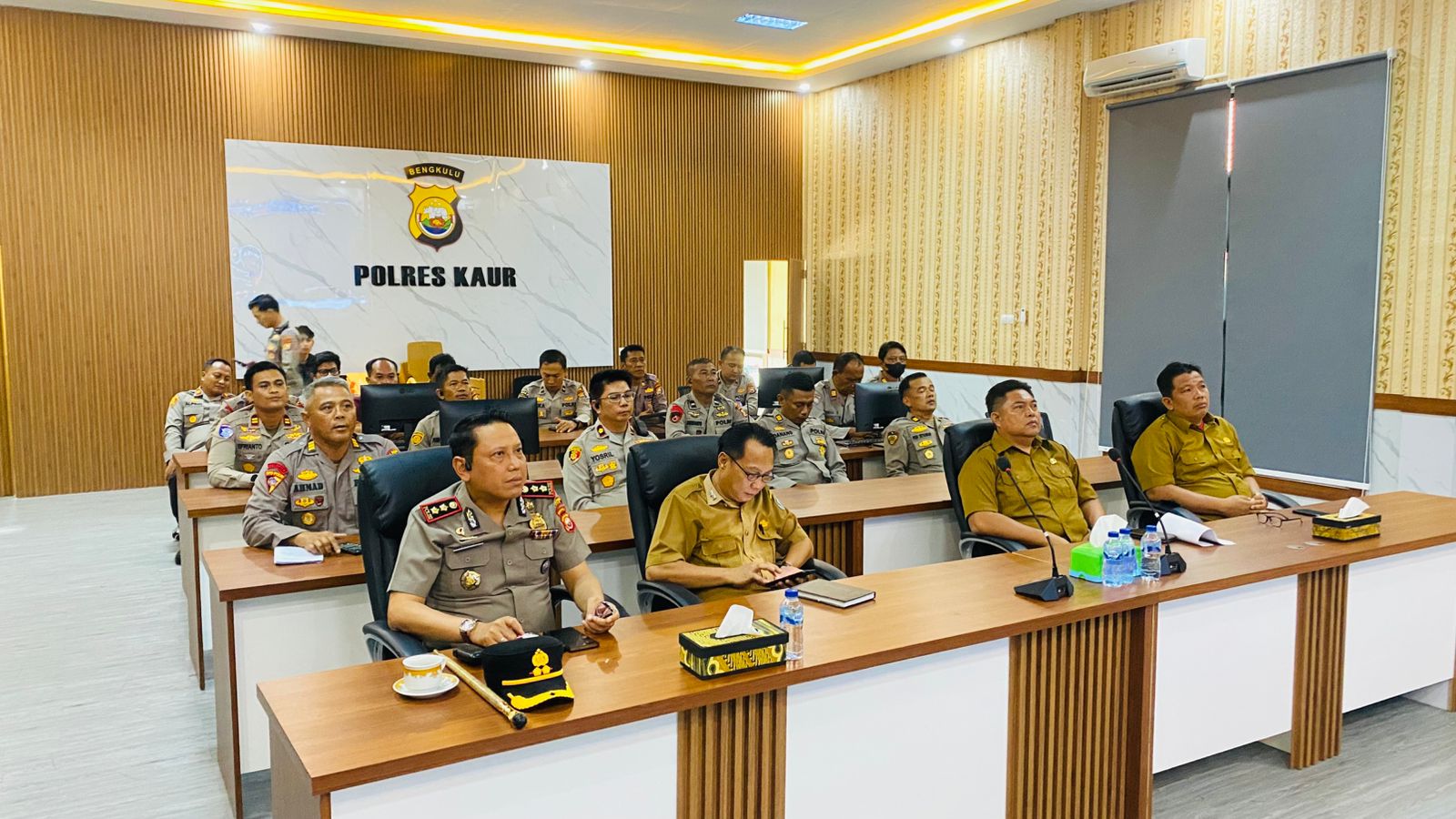 Kaur – Polres Kaur menggelar Zoom Meeting (Vicon) dalam rangka mengikuti arahan Wakapolri terkait antisipasi fenomena cuaca ekstrem El Nino “Godzilla”, Selasa (14/04/2026) pukul 14.00 WIB di Gedung Command Center (CC) Polres Kaur.