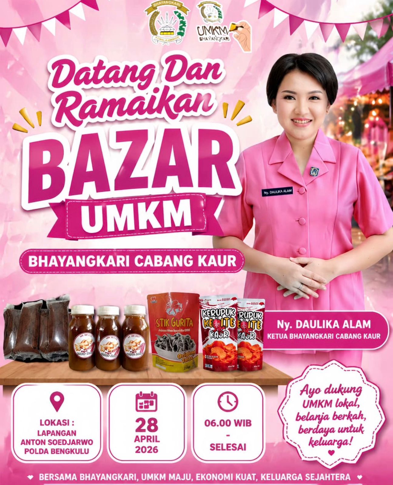 Bazar tersebut akan dilaksanakan pada 28 April 2026, bertempat di Lapangan Anton Soedjarwo Polda Bengkulu, mulai pukul 06.00 WIB hingga selesai. Acara ini terbuka untuk masyarakat umum yang ingin berbelanja sekaligus memberikan dukungan nyata kepada pelaku usaha kecil dan menengah.