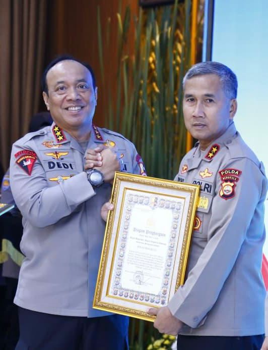 Penghargaan tersebut diterima langsung oleh Kapolda Bengkulu Irjen Pol. Mardiyono, S.I.K., M.Si. dalam rangkaian kegiatan Pembukaan Rakernis Gabungan Pusdokkes, Puskeu, Puslitbang dan Pusjarah Polri Tahun Anggaran 2026 yang dilaksanakan di Rupatama Mabes Polri, Jakarta Selatan.